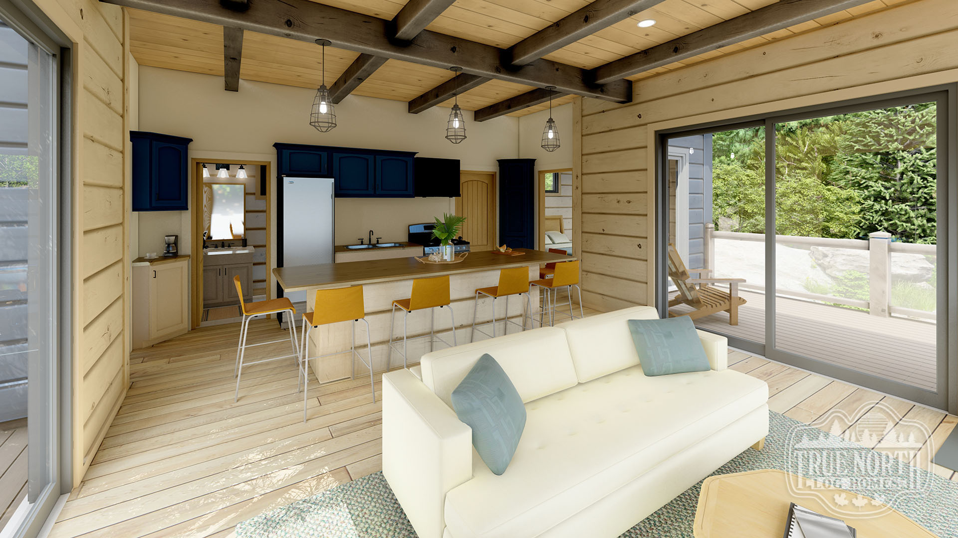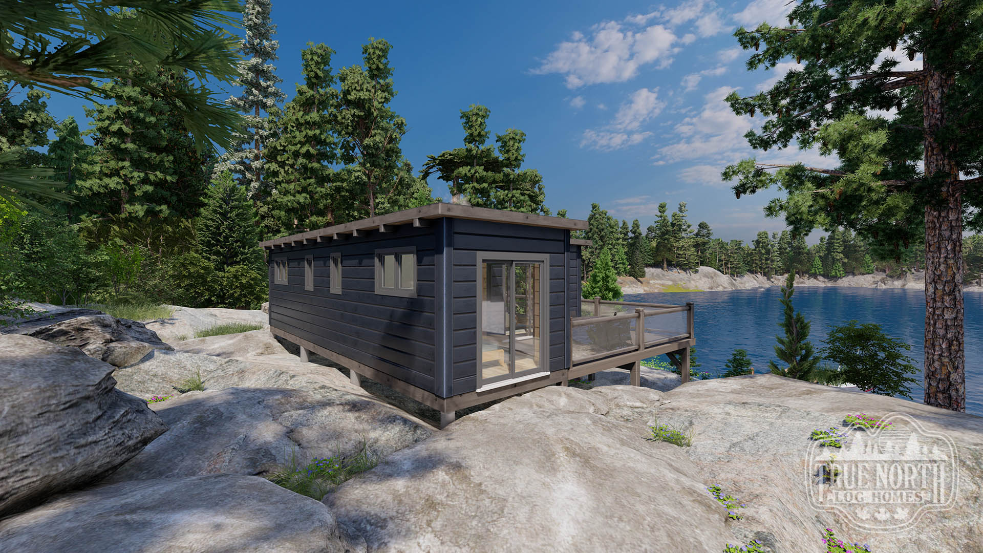 The Badgeley Point Cabin is the perfect weekend getaway. The contemporary design features a flat roof with exposed rafters. Concrete piers support this structure allowing it to sit on the rocky shoreline offering 270-degree views of the lake surrounding it. This two-bedroom build features a fully functioning galley-style kitchen with a large island for dining. Badgeley Point truly provides the best of both worlds when the lakeside doors are completely open and the great room flows nicely onto the large outdoor deck, making this lean build feel large and open.