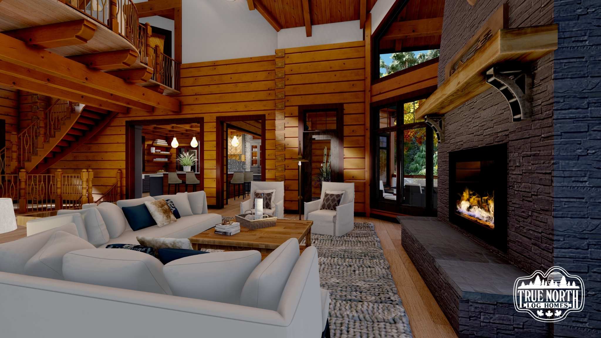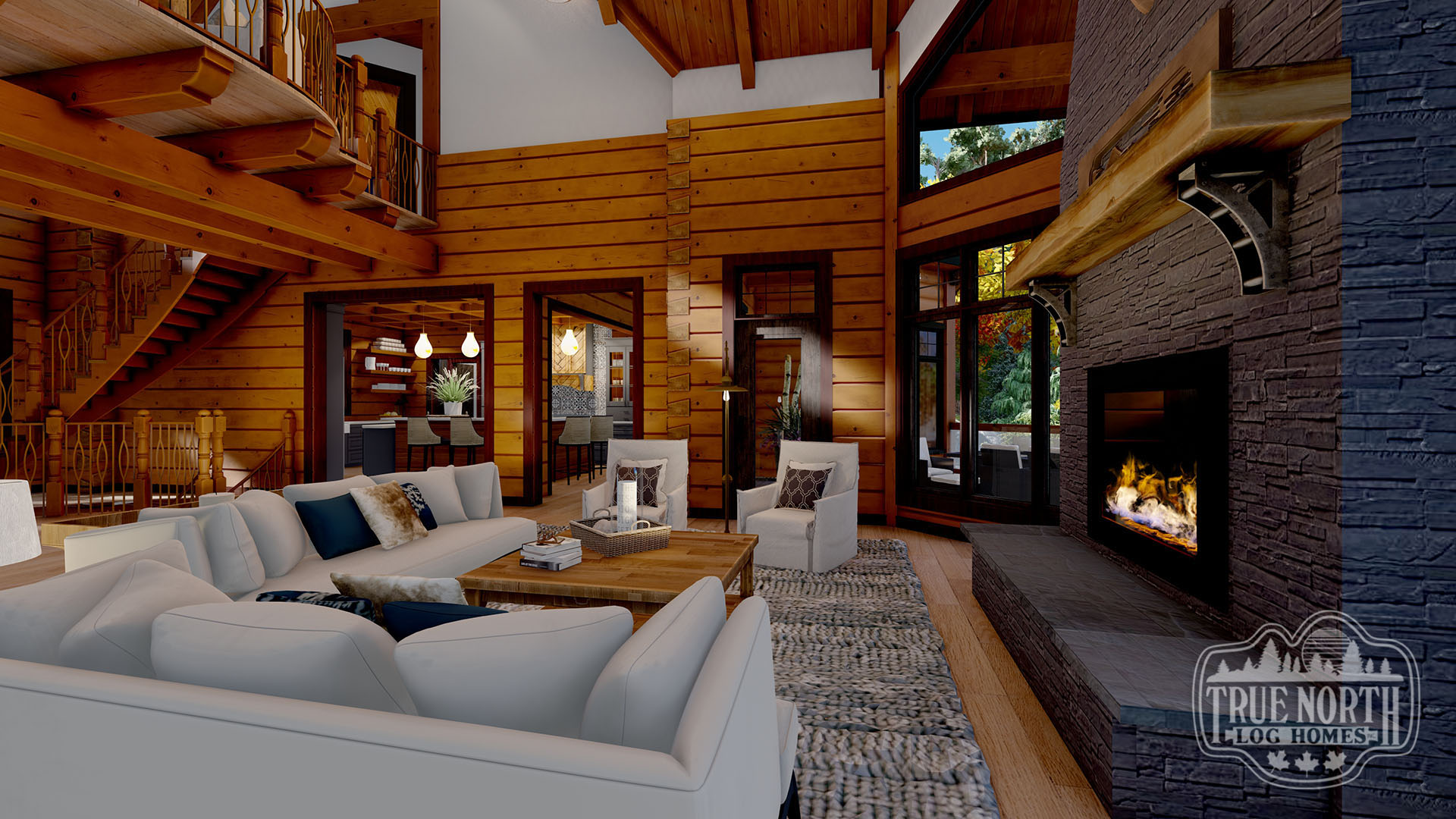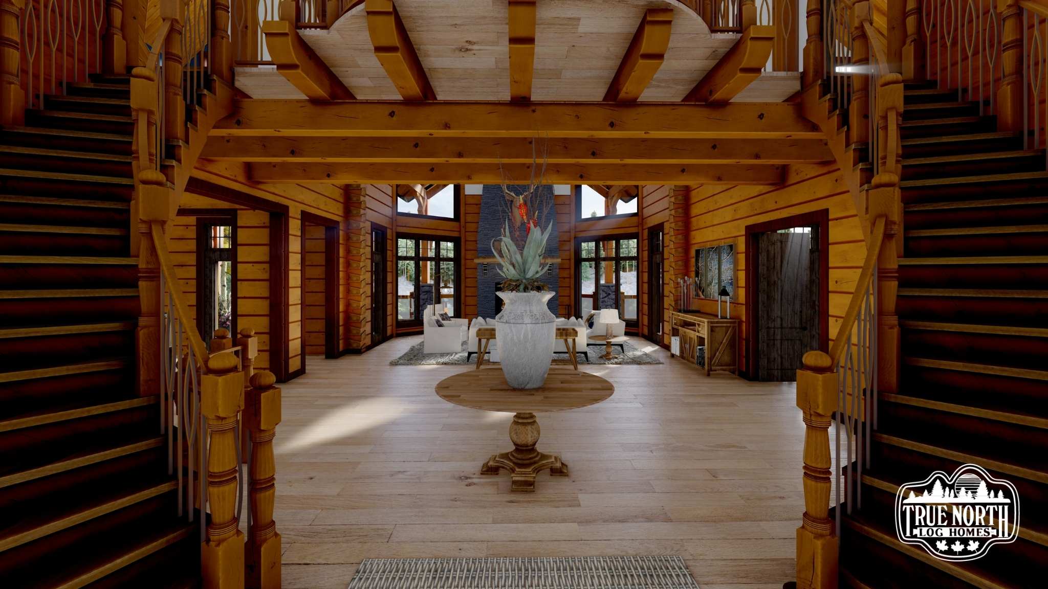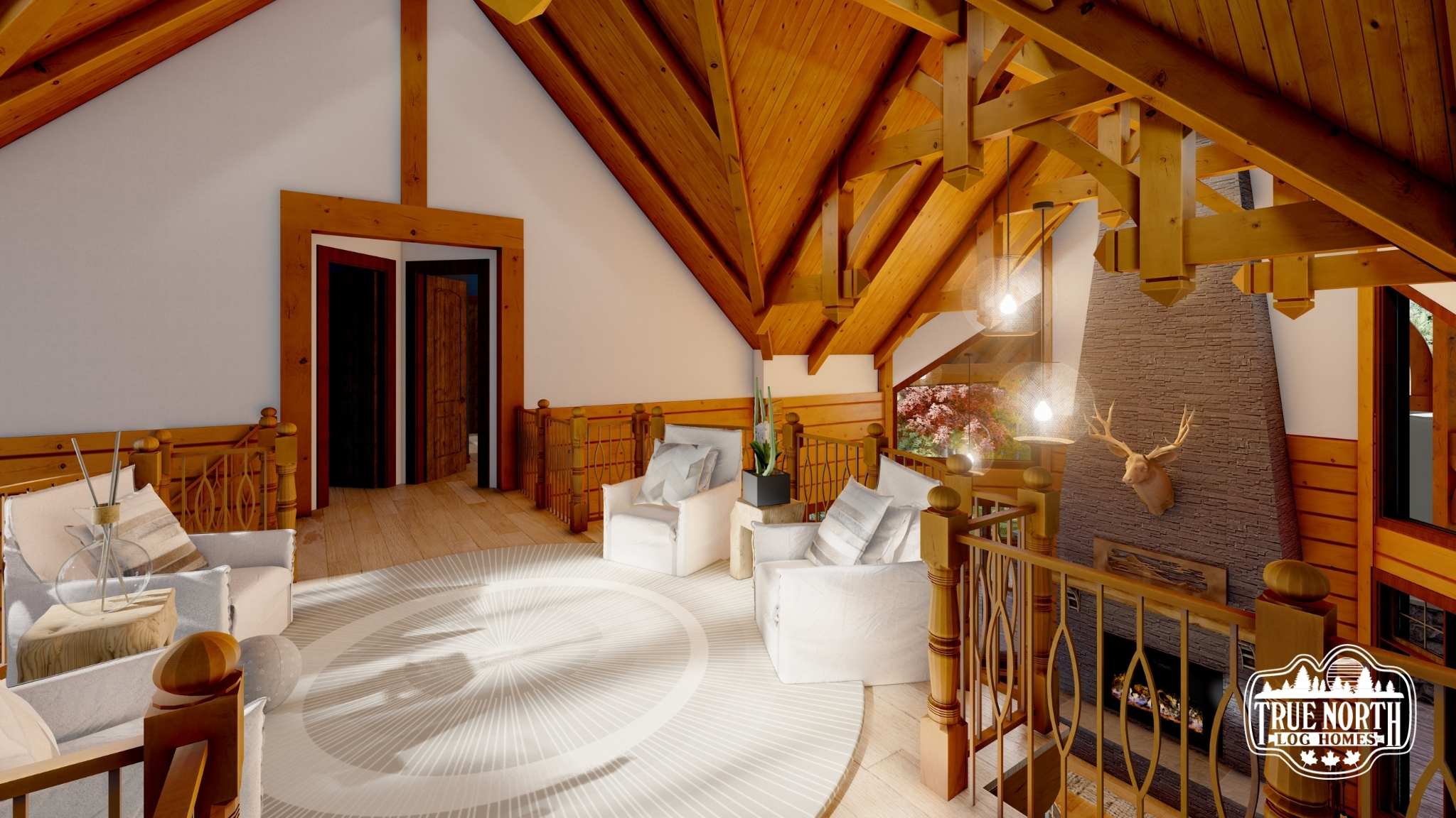 Designed with a European flavor, Brimstone is a fantastic home for large gatherings and has amazing characteristics that will not only spark conversation but will have your guests wanting to come back time, and time again. From the welcoming foyer with dual curved stairs and a unique loft above to the great room featuring beautifully crafted timber trusses and ceiling rafters. The kitchen is ideal for hosting lots of guests and lends itself to the eye-catching turret. Designed to capture you and your guests in the wonder of the timber rafters and our signature King post. The floor plan allows for two master suites and a spare bedroom with an attached en suite, and office. A truly spectacular Model that includes every timber and stone feature imaginable.