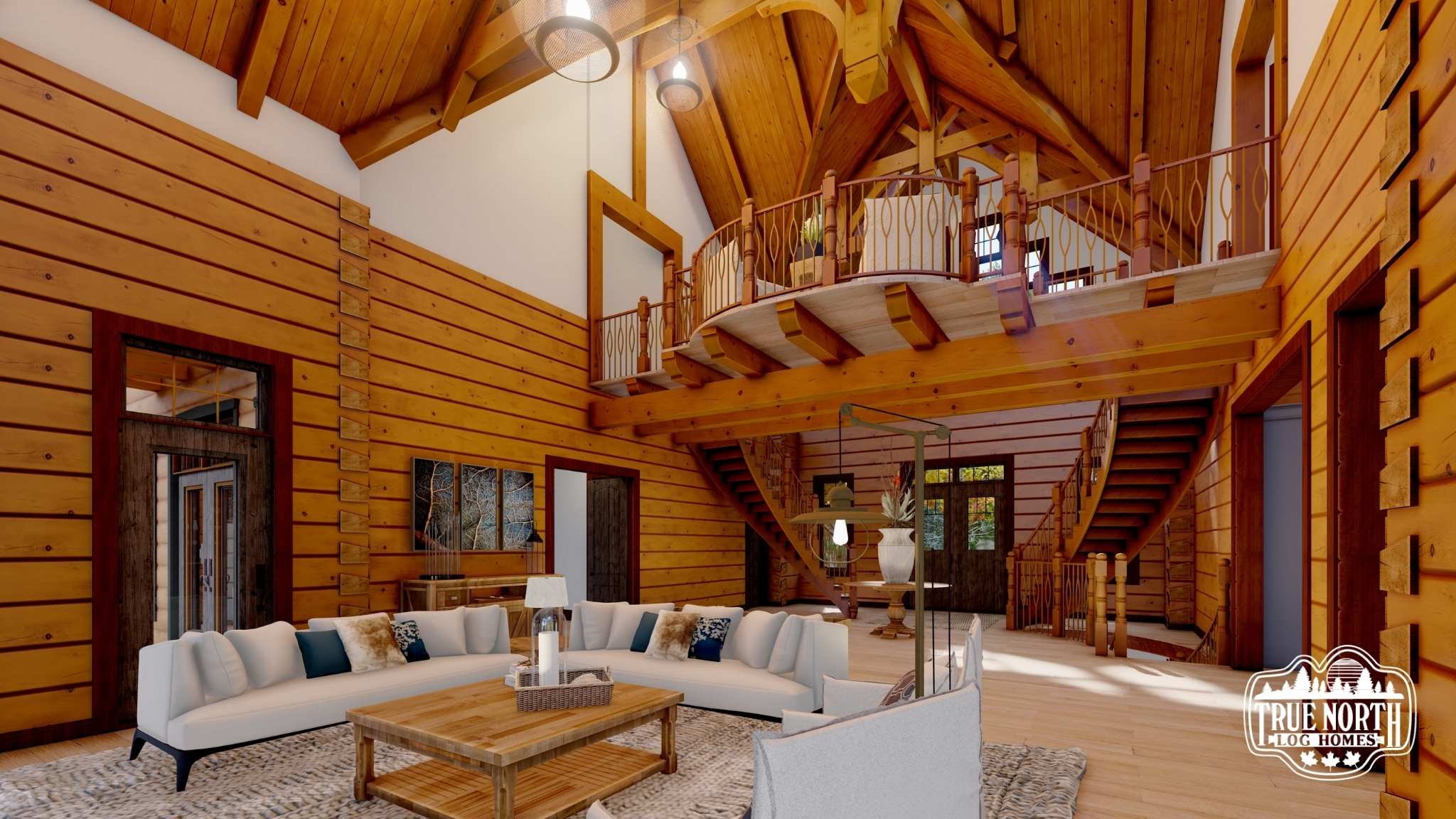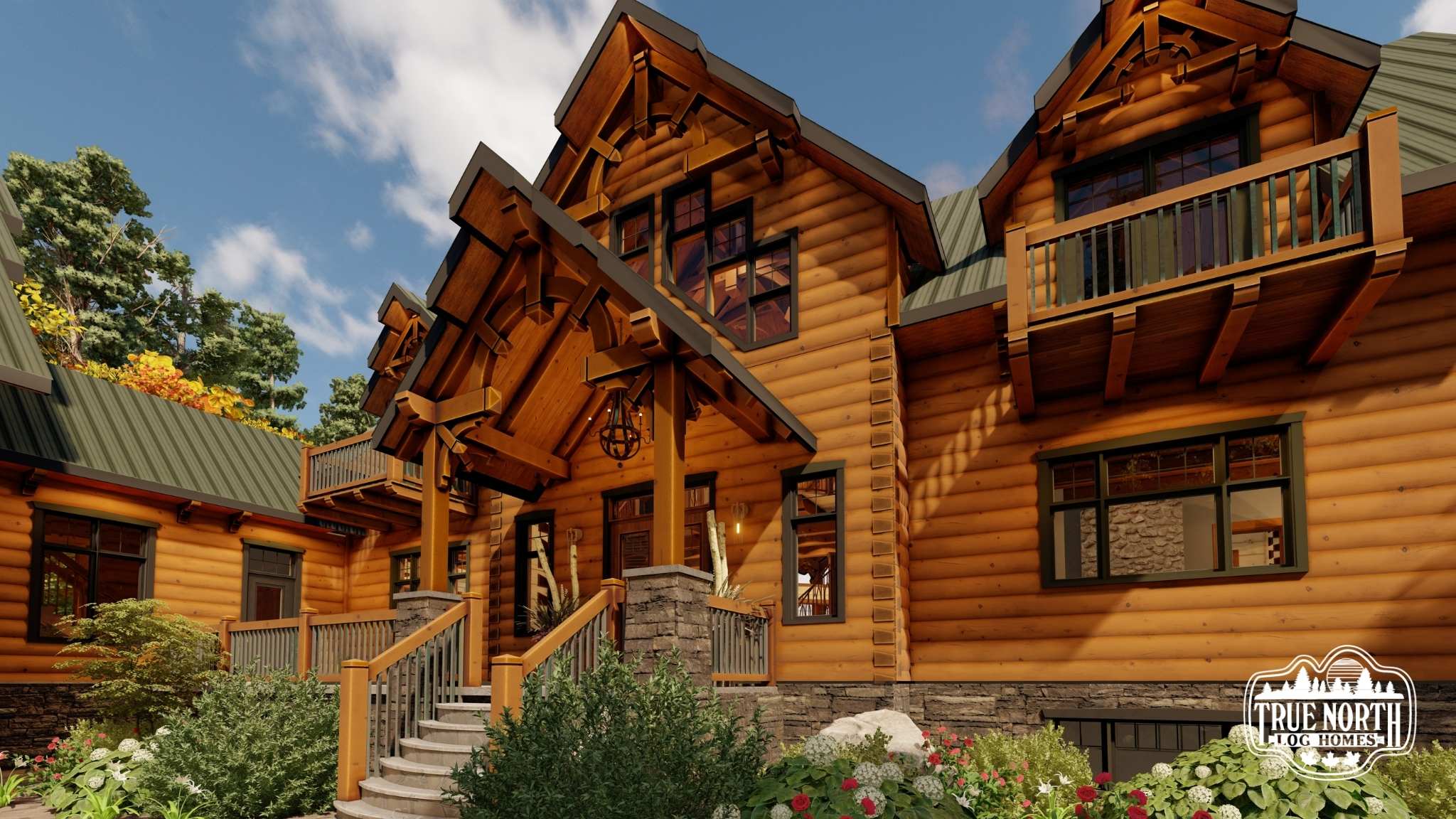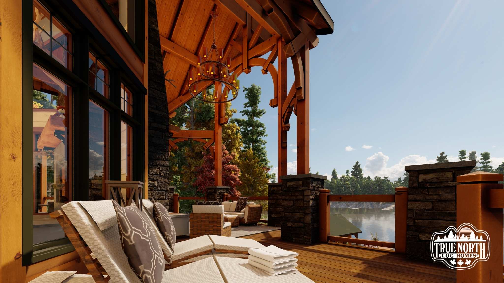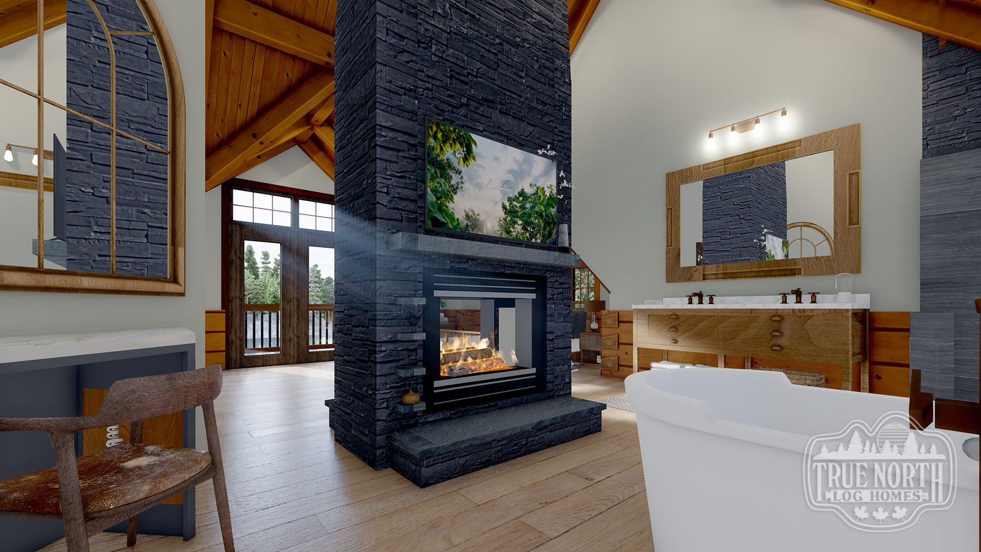 Designed with a European flavor, Brimstone is a fantastic home for large gatherings and has amazing characteristics that will not only spark conversation but will have your guests wanting to come back time, and time again. From the welcoming foyer with dual curved stairs and a unique loft above to the great room featuring beautifully crafted timber trusses and ceiling rafters. The kitchen is ideal for hosting lots of guests and lends itself to the eye-catching turret. Designed to capture you and your guests in the wonder of the timber rafters and our signature King post. The floor plan allows for two master suites and a spare bedroom with an attached en suite, and office. A truly spectacular Model that includes every timber and stone feature imaginable.