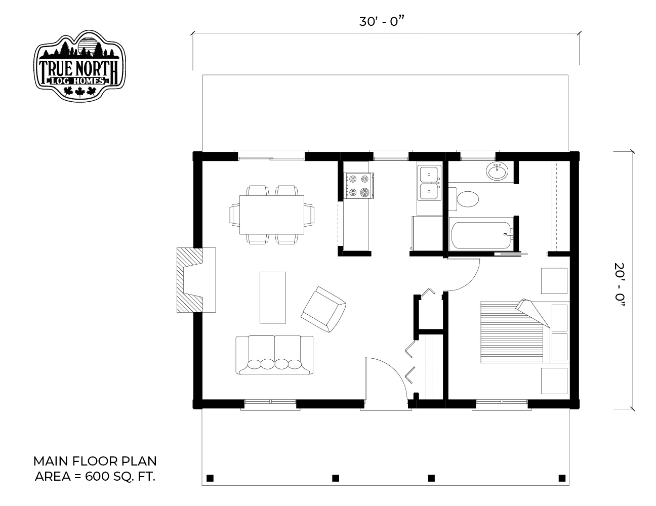 With off the grid cabin living in mind the Killarney I is the perfect setup for an individual, or couple. This 600 sq. ft. home includes a living or sitting area, a dining area, compact kitchen, full bathroom, and 1 bedroom. On the outside of the home you’ll find a deck area that spans the width of the home and is perfect for enjoying quiet evenings on. With customizations available the Killarney I can be the perfect addition to your secluded property.