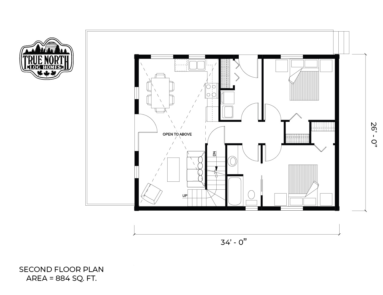 The Killarney II model is what comes to mind when you think of a traditional log home. The main floor has an open cabin-style living area with a kitchen, dining room, and den area. In the center you’ll find a hallway that takes you to the utility room, bedrooms, and bathroom. Up the stairs you’ll find a loft that has space for a living area, or could be converted into a third bedroom if required.
