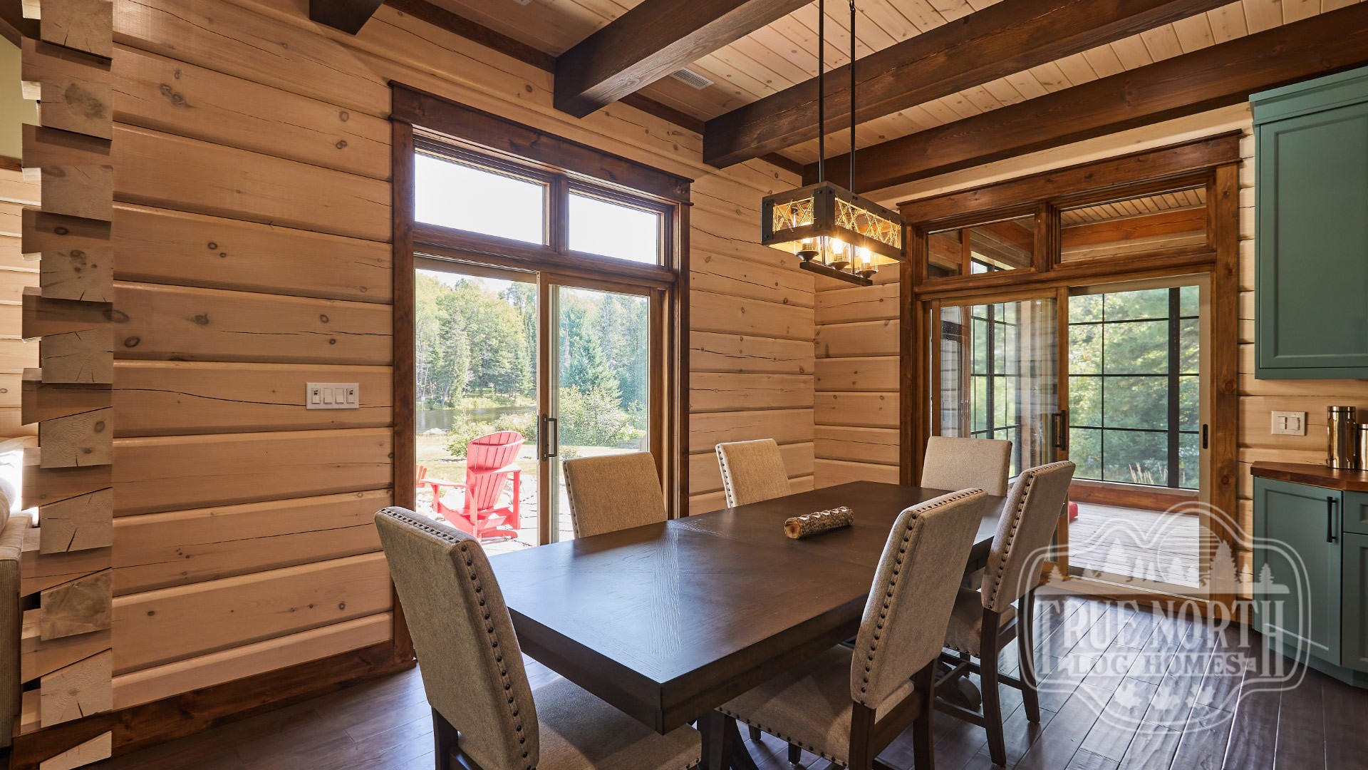 Building on the popularity of the Lakeview I and Lakeview II, we’re pleased to bring you another contemporary style design: the Riverview. Boasting 3 bedrooms, 2 baths, double car garage and screen porch, this modern log home design floods you with natural light in the double storey foyer upon entry. Straight ahead, the secondary bedrooms await. To the right, you’ll find a well-appointed kitchen and dining area which lead to the screened-in porch. The great room, with its 13’ ceilings and panoramic views, is the perfect spot to relax with friends and family. It’s easy to see why this efficient “L” shaped plan is quickly becoming a favorite.