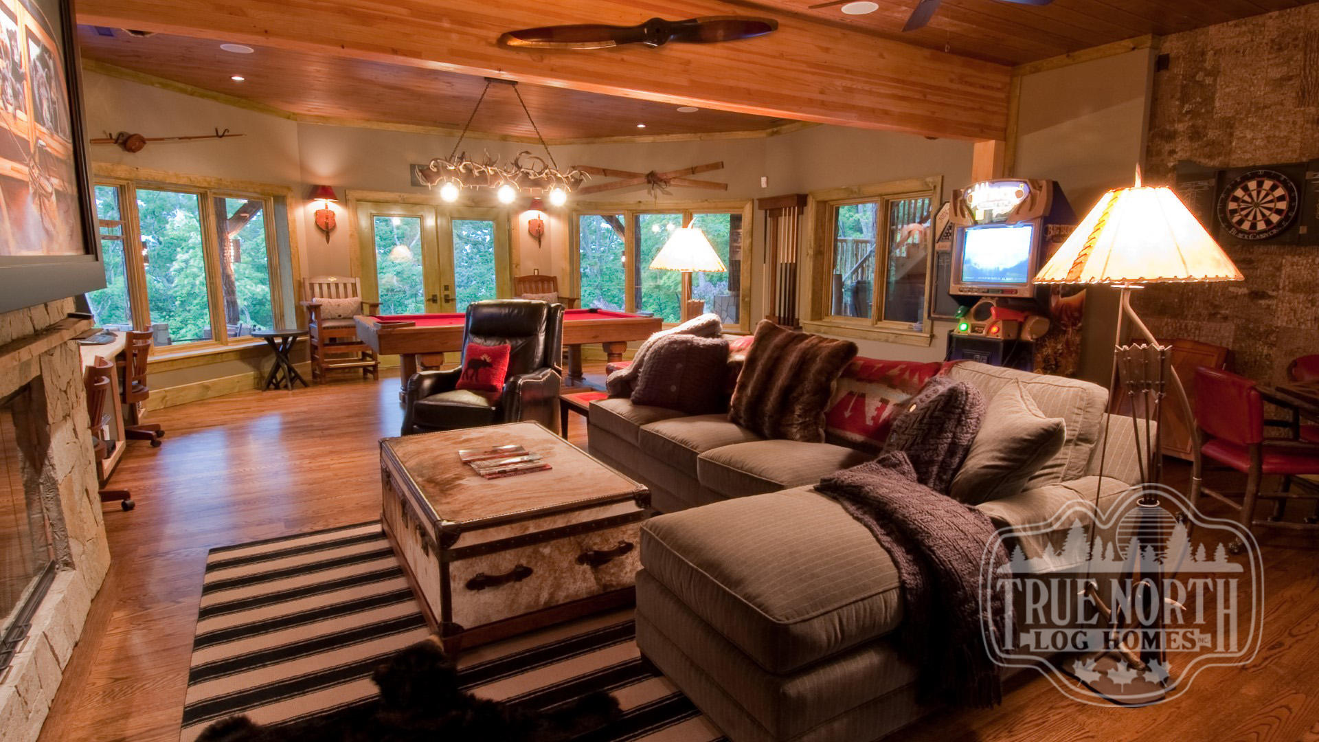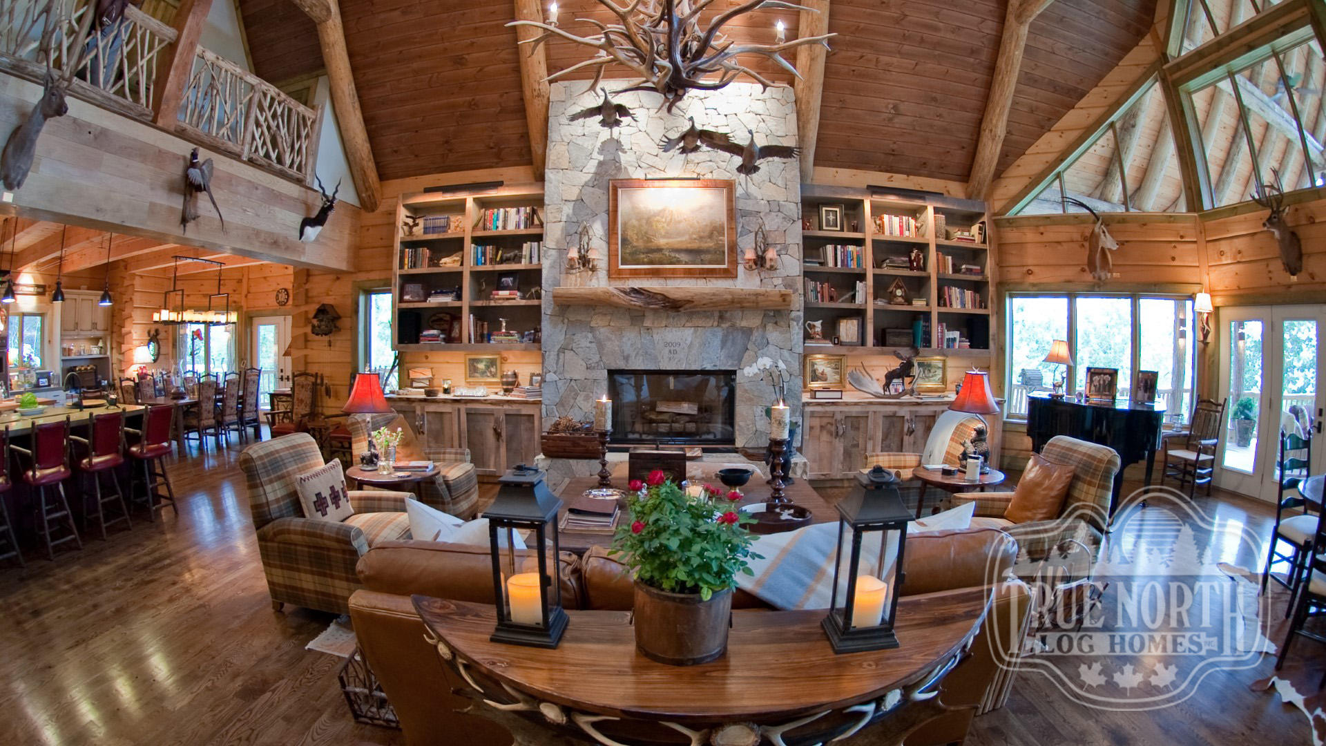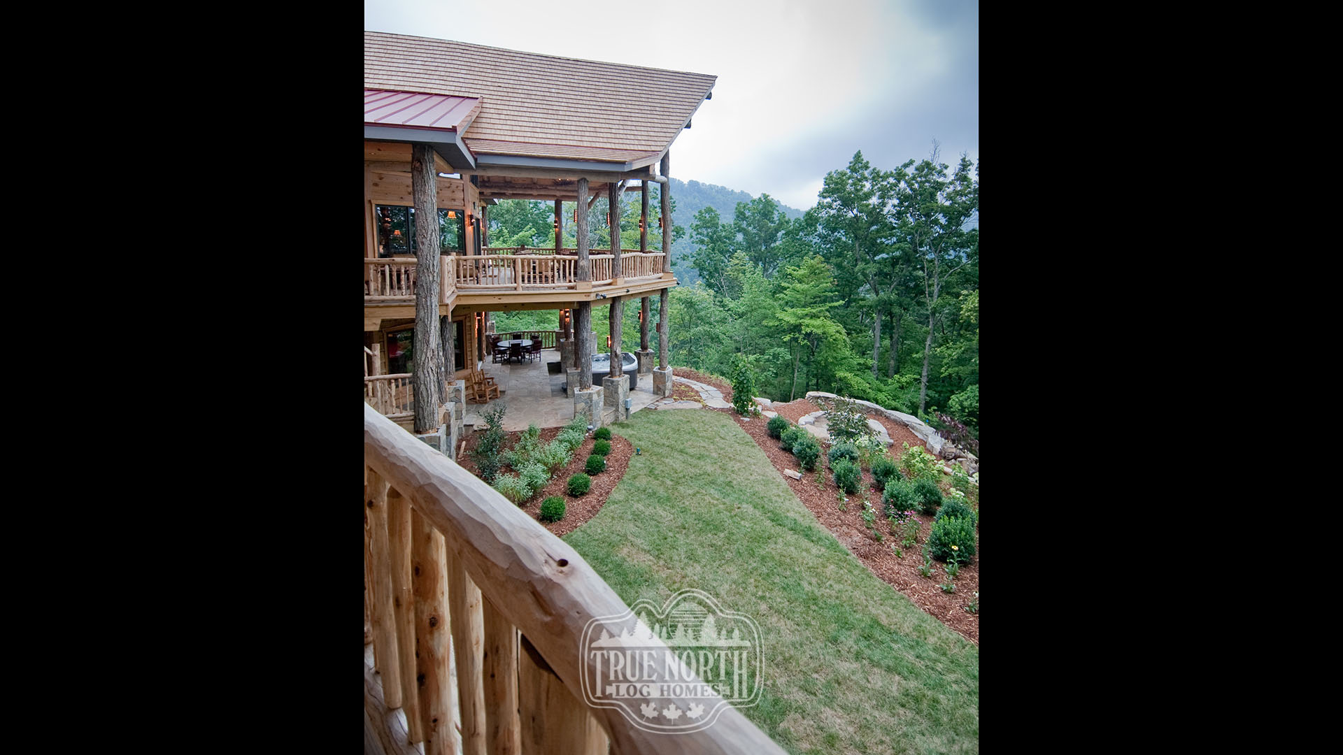 This beautiful log home is fully custom-built. The grand front entry of this True North log home features a large, vaulted log drive-thru portico. A unique staircase bridges the gap between the driveway and the porch and grants access to the large outdoor living area. The home is focused on low energy consumption and environmental soundness.