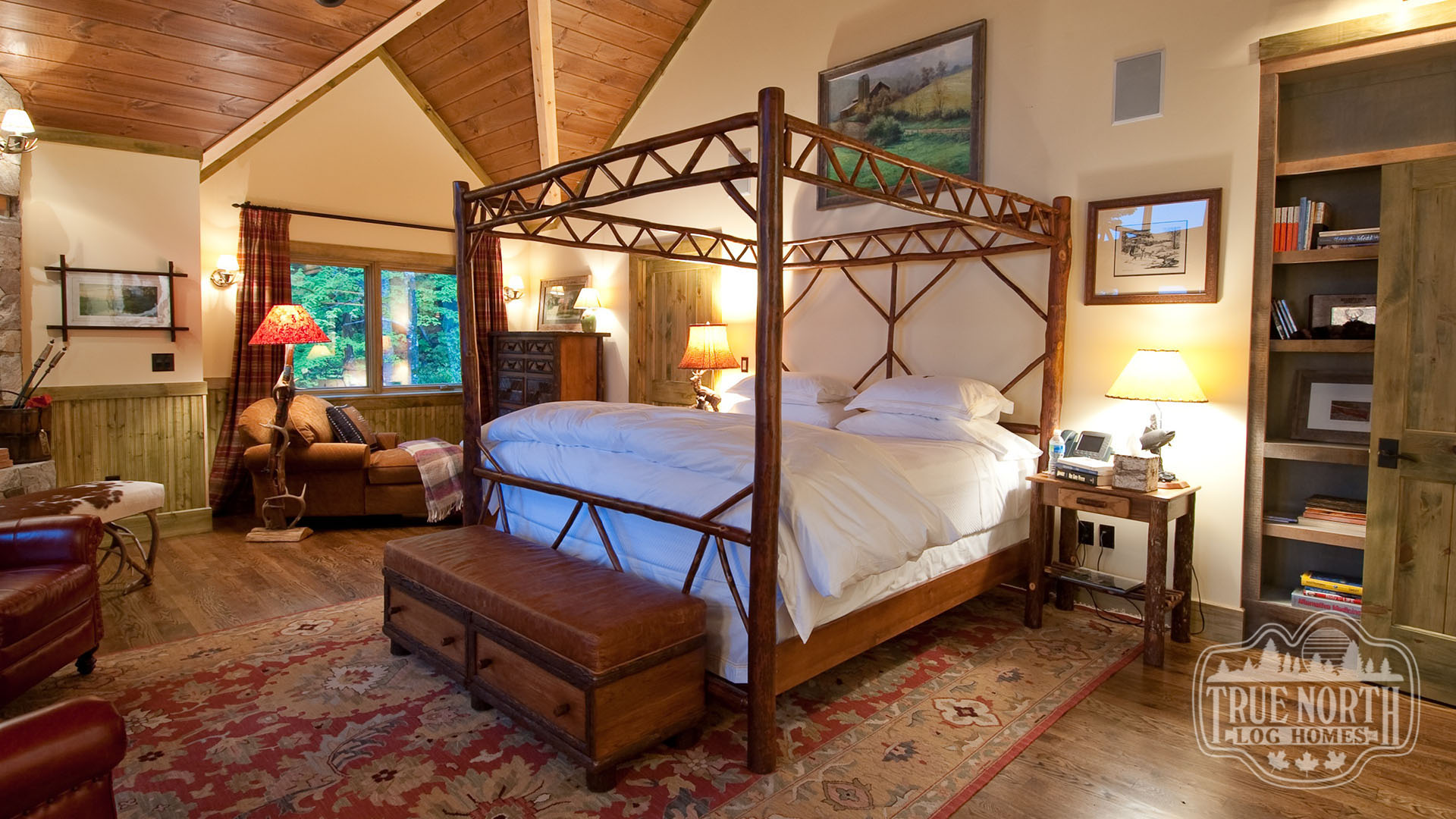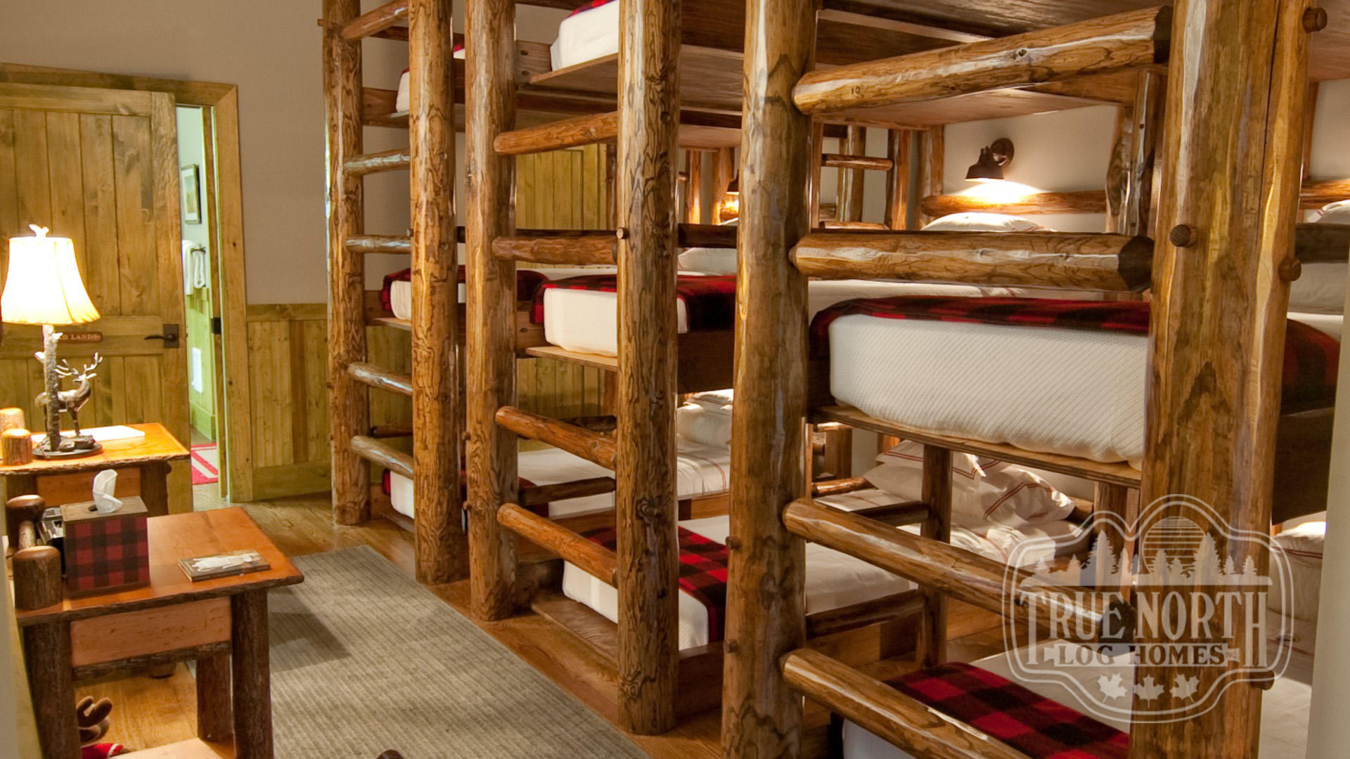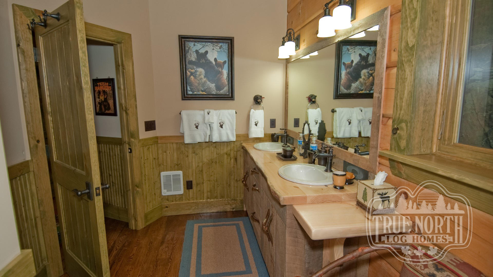 This beautiful log home is fully custom-built. The grand front entry of this True North log home features a large, vaulted log drive-thru portico. A unique staircase bridges the gap between the driveway and the porch and grants access to the large outdoor living area. The home is focused on low energy consumption and environmental soundness.
