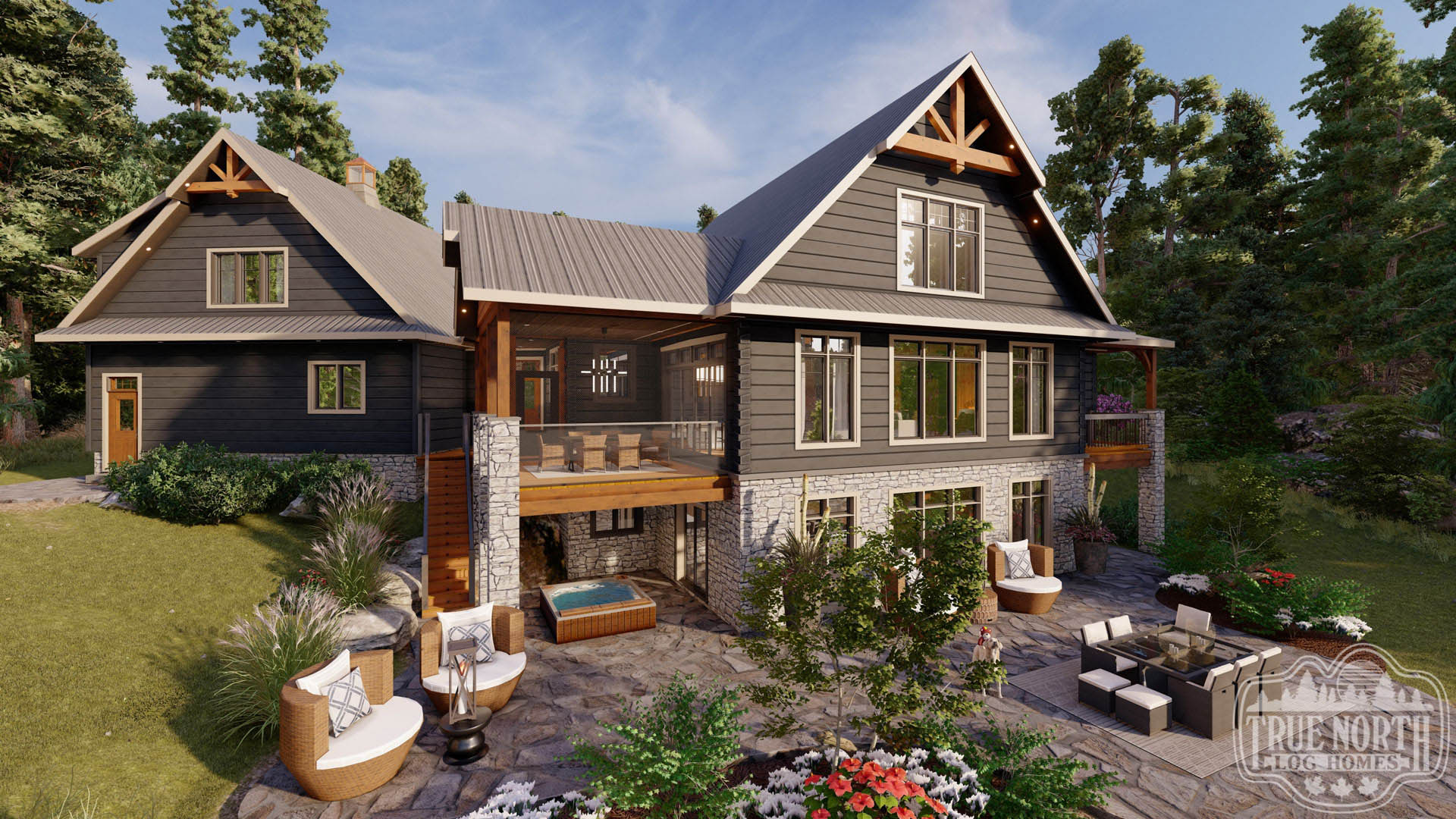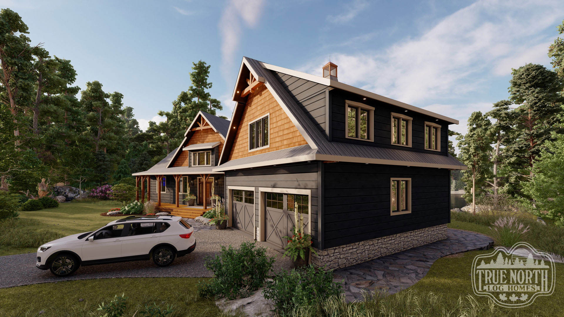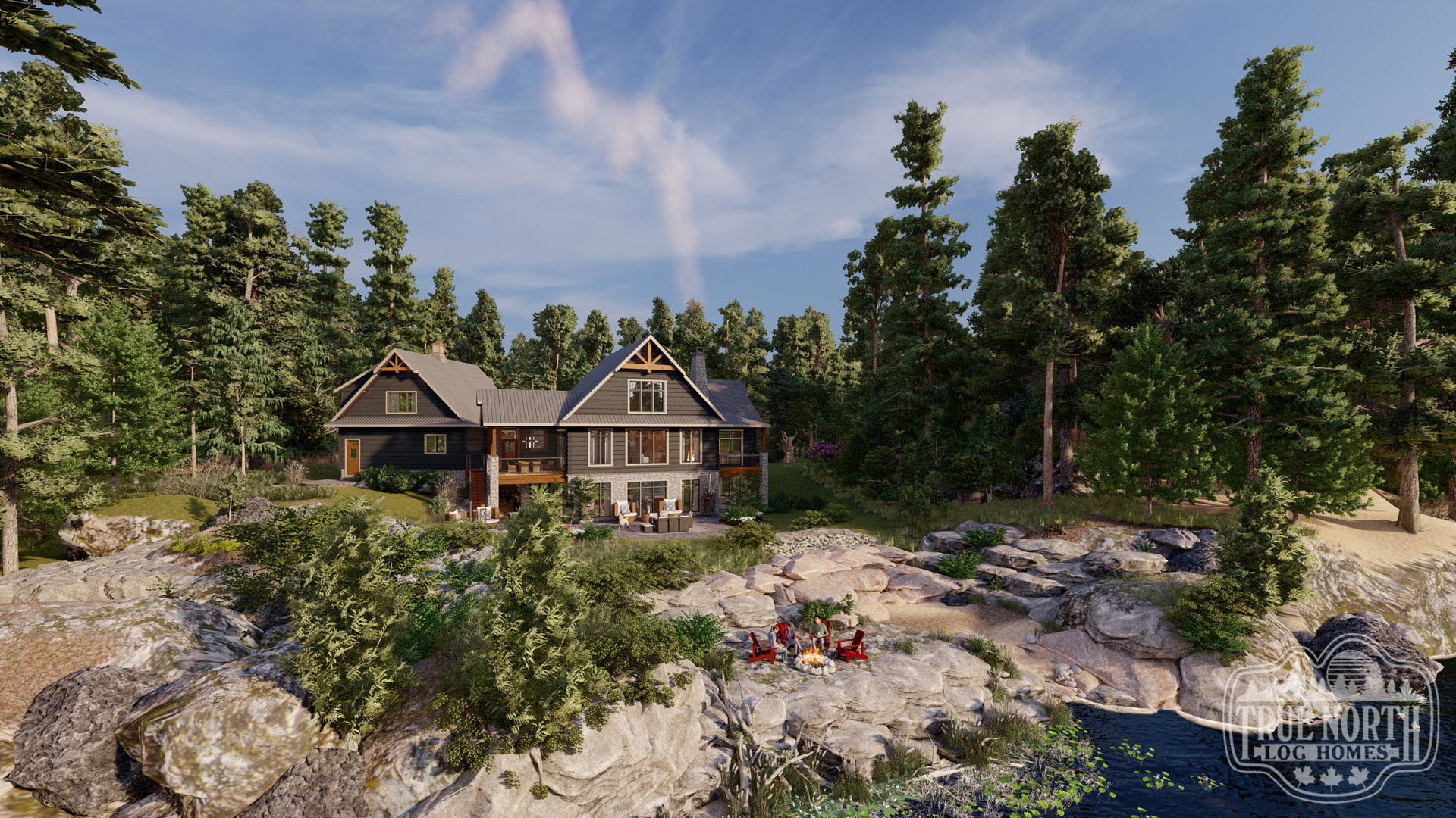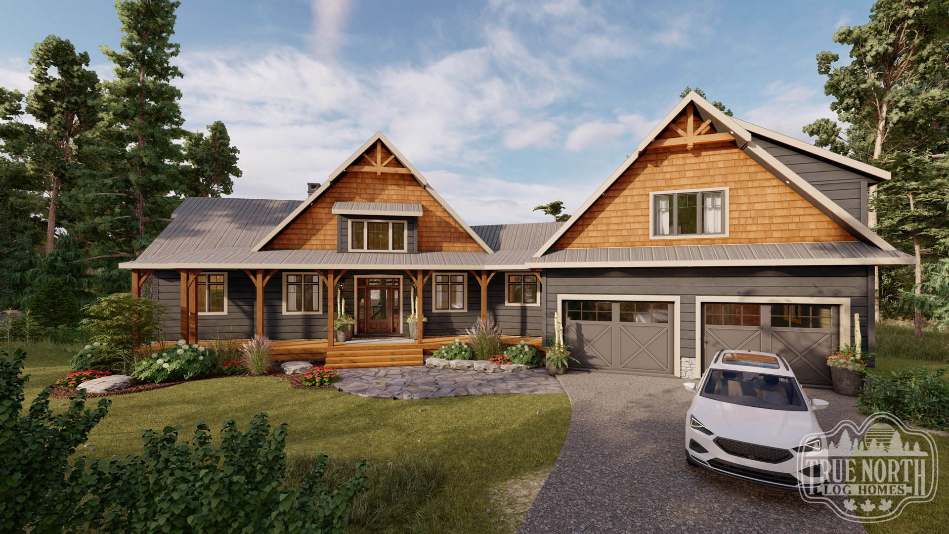 Welcome to the re-imagined Tranquil Waters, this design keeps the elegant features of the Tranquil Water IIb, puts it on a bungalow plan. The creative front entry with the shed dormer and the decorative timber braces for the porch remain as the true statement for the home. The vision adds a Muskoka room for outdoor entertaining off the kitchen/ dining area, and an individual deck for the Master Bedroom. The new floor plan gives a new layout for the kitchen and living room. This adds a new flavour to the efficient layout plan that Tranquil Waters is known for.