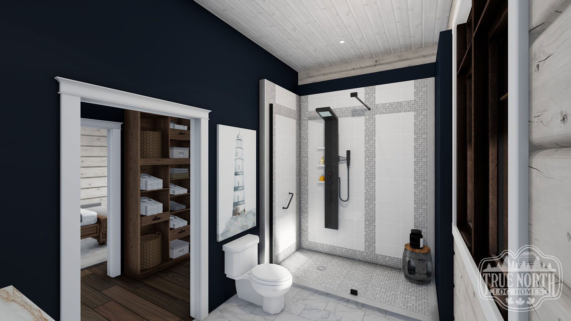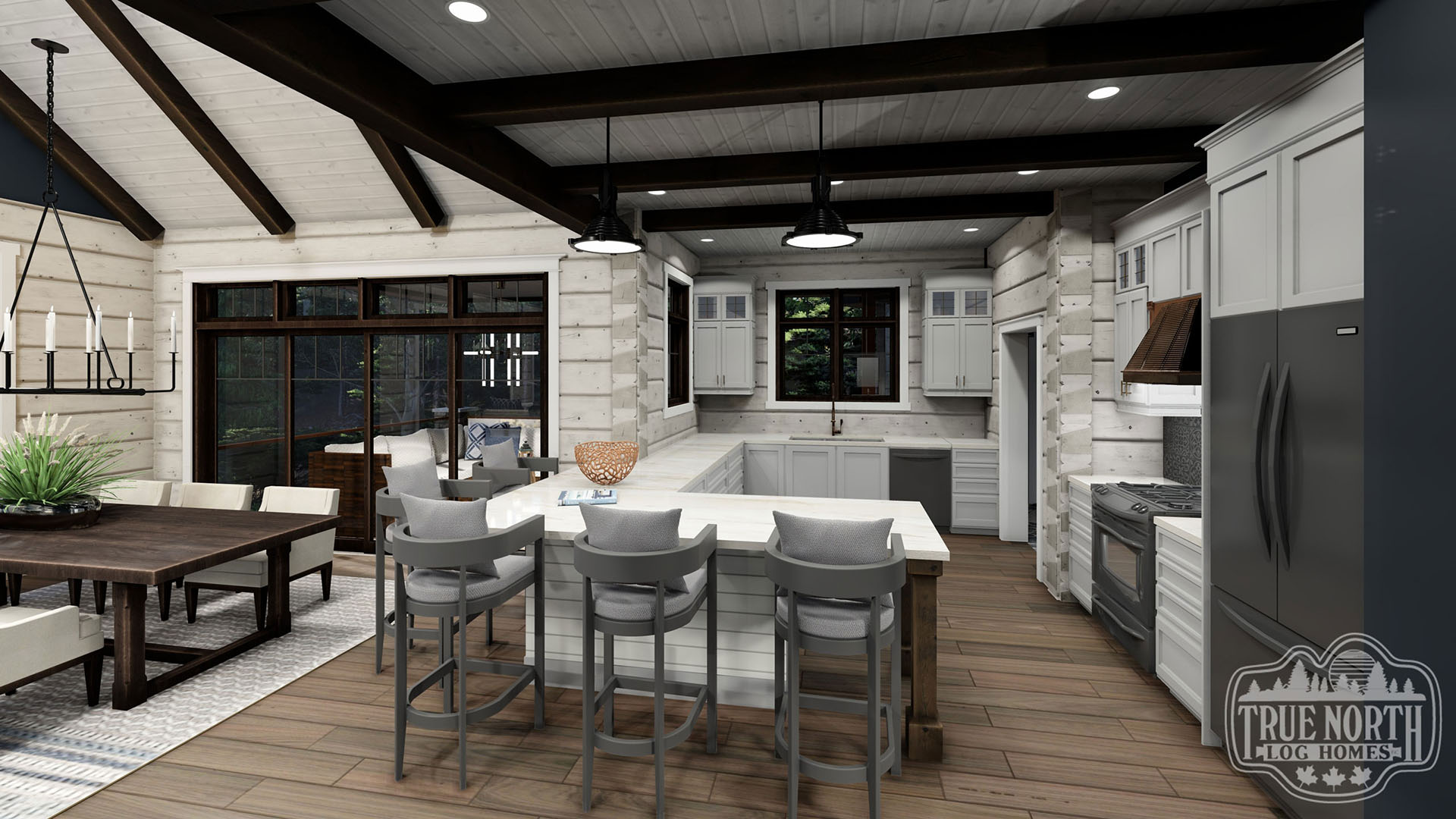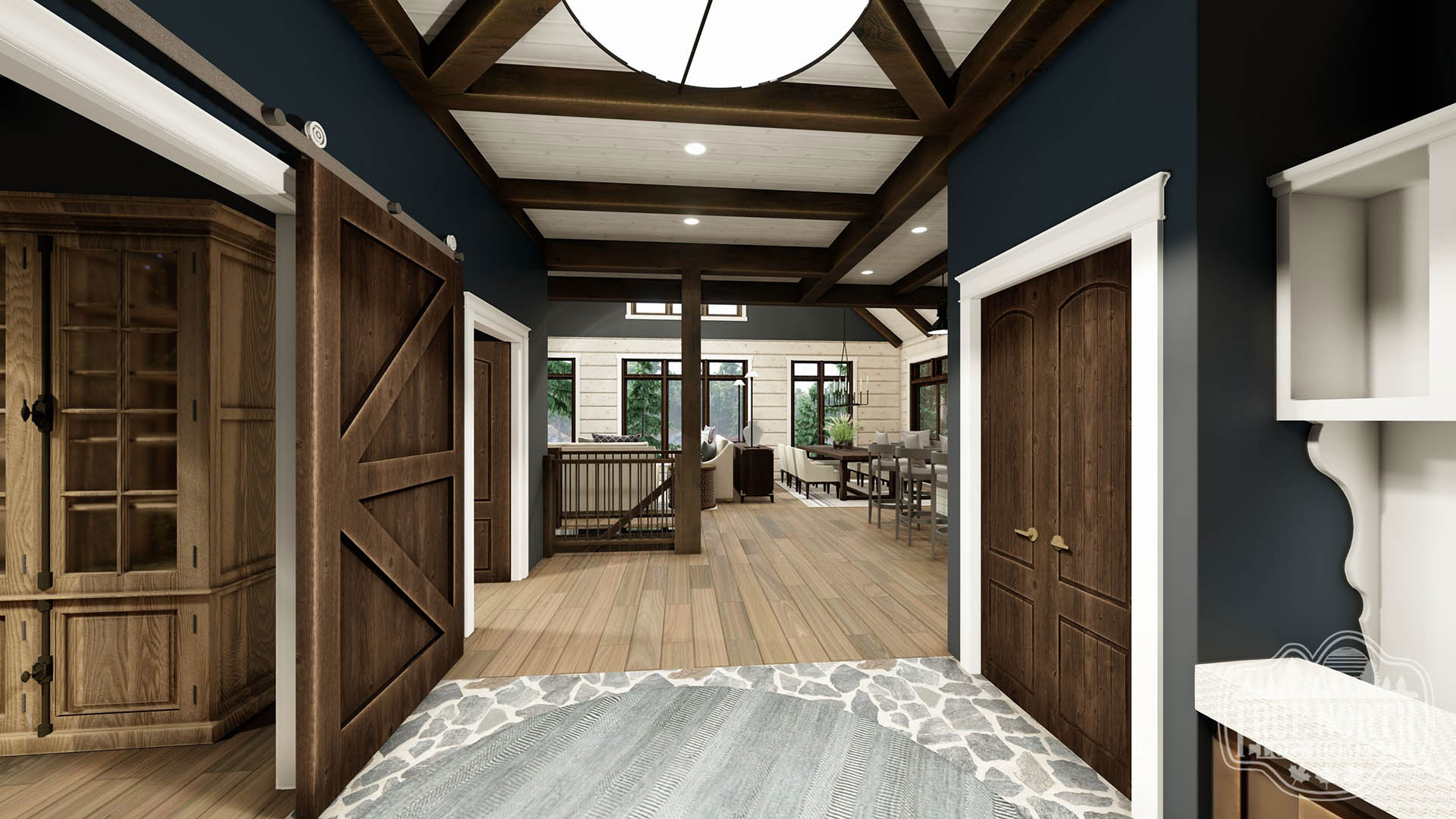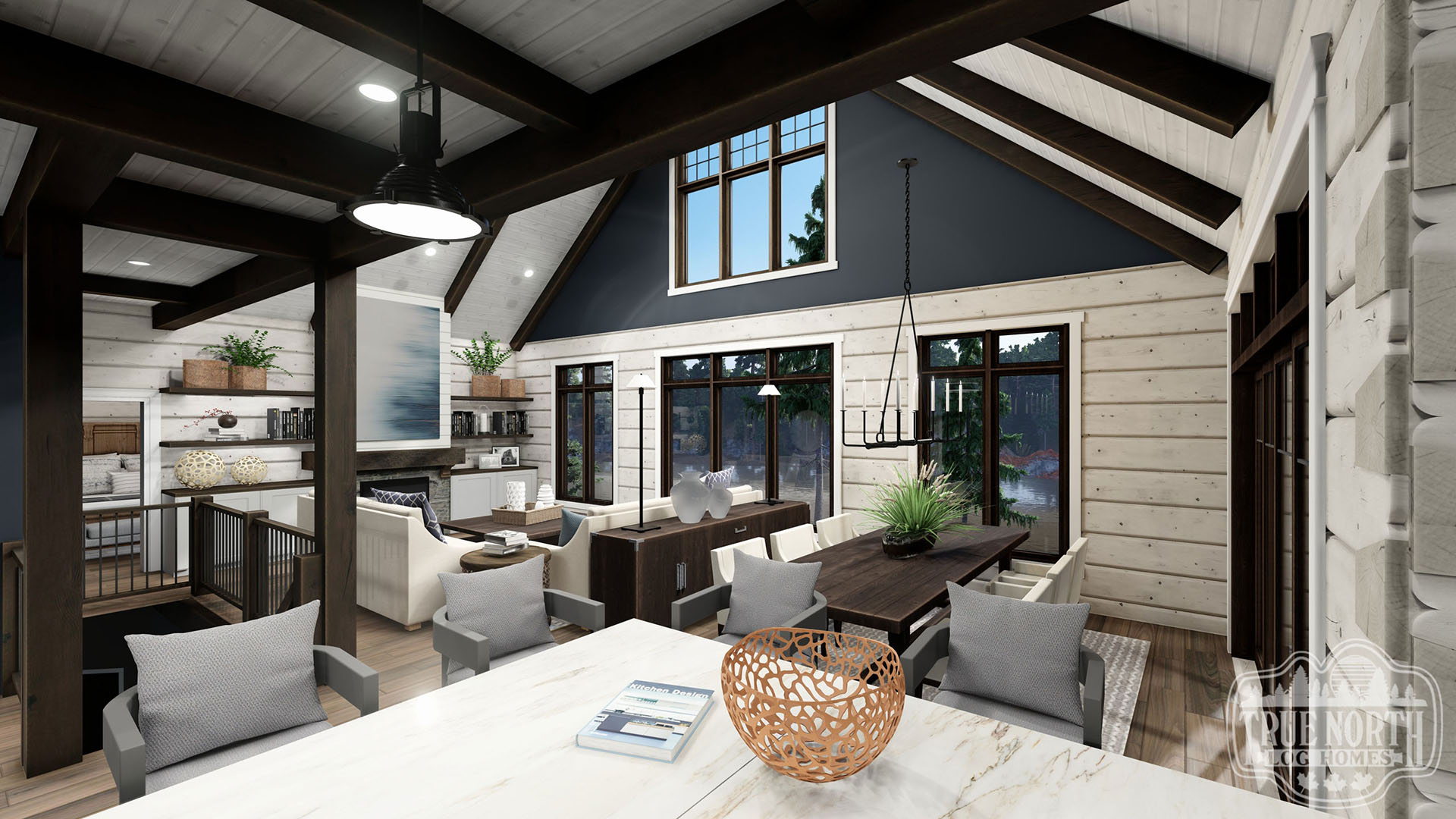 Welcome to the re-imagined Tranquil Waters, this design keeps the elegant features of the Tranquil Water IIb, puts it on a bungalow plan. The creative front entry with the shed dormer and the decorative timber braces for the porch remain as the true statement for the home. The vision adds a Muskoka room for outdoor entertaining off the kitchen/ dining area, and an individual deck for the Master Bedroom. The new floor plan gives a new layout for the kitchen and living room. This adds a new flavour to the efficient layout plan that Tranquil Waters is known for.